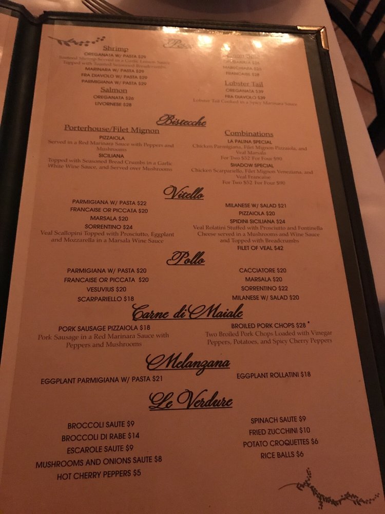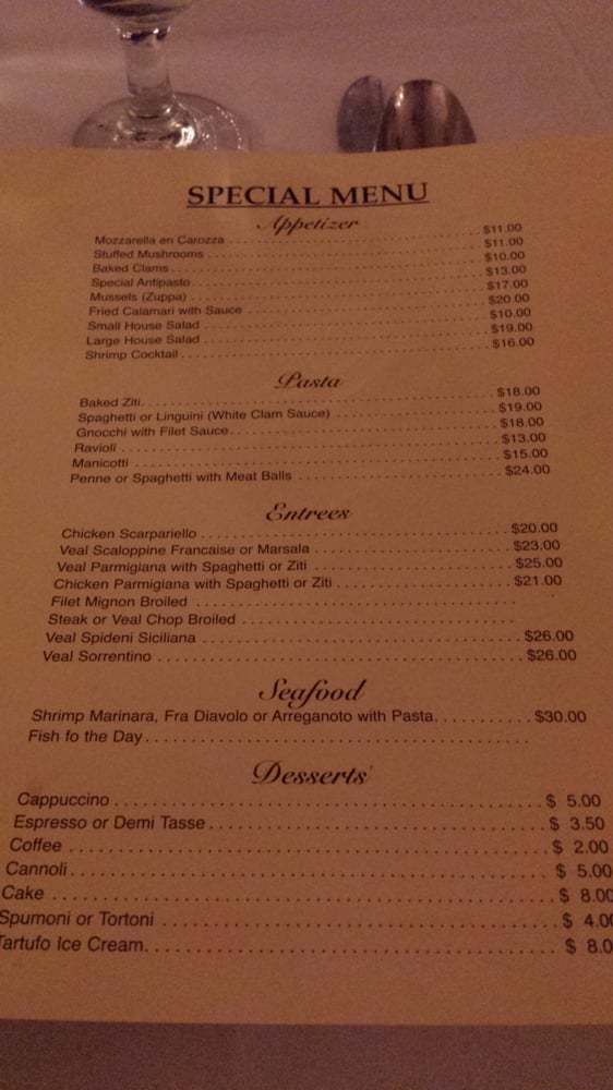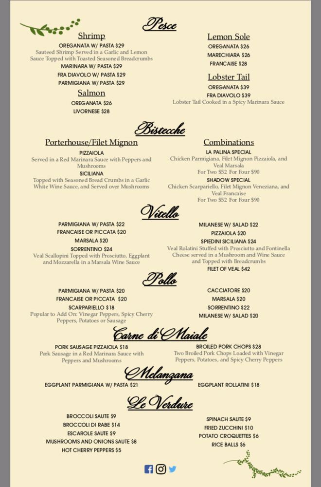 Chicken parmigiana, filet mignon pizzaiola, and veal marsala.